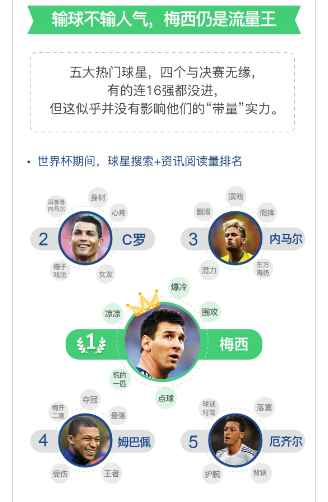 梅西、C罗、内马尔、姆巴佩和厄齐尔荣登百度App热门球星榜首,虽然其中4人已因球队出局陆续离场,但依然阻止不了他们成为资讯“流量王”的步伐。